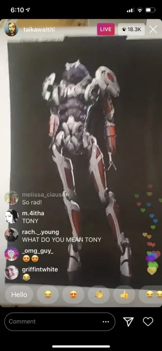 Waititi assistiu Thor: Ragnarok enquanto conversava com fãs online. Em determinado momento, ele perguntou se todos gostariam de ver um pouco do novo exoesqueleto que será usado por Miek.