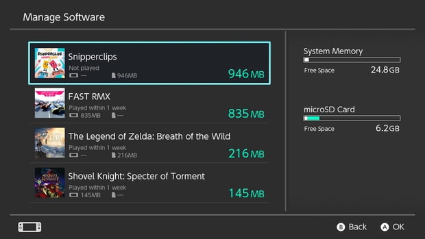 Compras no eShop podem ser instaladas no cartão microSD, se houver um presente. Se você não tiver um cartão no slot, ele vai instalar no armazenamento interno, se houver espaço suficiente. Dito isto, você não tem nenhum controle sobre onde as coisas são instaladas além de optar por ter um microSD inserido ou não. Tal como acontece com salvar os jogos, não há nenhuma maneira de mover arquivos de um local pra outro. As suas compras no eShop estão ligadas à sua conta Nintendo, por isso, se tiver sessão iniciada num dispositivo, tem acesso aos jogos que possui e pode transferi-los. Você não pode tirar um microSD de um dispositivo e colocá-lo em outro. Se você tentar, ele lança a mensagem de erro dizendo que o cartão está vinculado a um Switch diferente.
