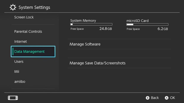 Não. Os dados de salvamento do Switch são armazenados na memória do console e atualmente não podem ser copiados. Em Data Management, há uma opção “manage save data/screenshots”, mas quando selecioná-la, tudo o que você pode fazer é excluir os arquivos – não há nenhuma opção pra movê-los pro cartão de memória ou fazer qualquer backup. Também não há nenhuma opção de salvar na nuvem. Seus jogos estão atualmente vinculados ao seu dispositivo e apenas isso. Agora, se perder o seu Switch ou ele morrer, você se ferrou muito bonito e não há nenhuma maneira de recuperar o save.