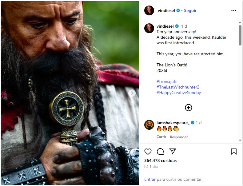 Com as gravações previstas para começarem em breve, a expectativa é que ‘O Último Caçador de Bruxas 2: O Juramento do Leão’ chegue aos cinemas no segundo semestre de 2026 — marcando o retorno de Vin Diesel a um dos papéis mais misteriosos de sua carreira.
