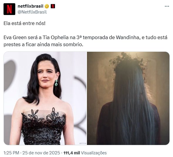 Se você achava que a família mais excêntrica da cultura pop não poderia ficar mais interessante, pense novamente. A Netflix acaba de confirmar uma adição de peso ao elenco da aguardada 3ª temporada de Wandinha. A talentosa atriz Eva Green foi a escolhida para dar vida à enigmática Ofélia Frump, irmã de Morticia Addams, encerrando de vez o mistério que assombrou os fãs no final do segundo ano da série.