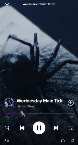 Ao dar play na playlist, fãs notarão uma surpresa: a Coisa, icônica mãozinha da família Addams, ganha vida na barra de progresso. Ela se move, aparece e desaparece, reforçando o clima macabro e bem-humorado que define a série.